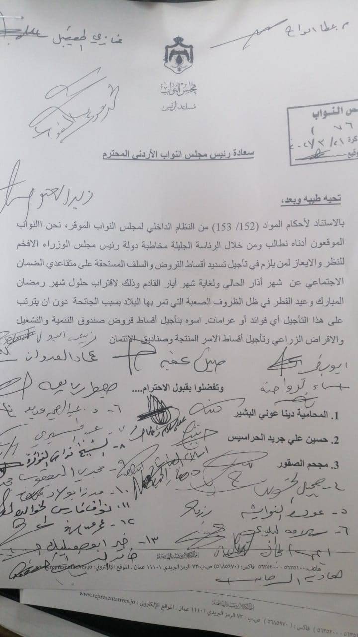 وجاء في المذكرة التي تبنتها النائبة دينا البشير أن يكون ذلك دونَ أن يترتّبَ على التأجيلِ أيّ فوائدٍ أو غرامات، وذلكَ أُسوةً بتأجيلِ أقساط قروضِ صندوق التنمية والتشغيل والإقراضِ الزراعي، وتأجيلِ أقساطِ الأُسر المـُنتجةِ وصناديق الائتمان.