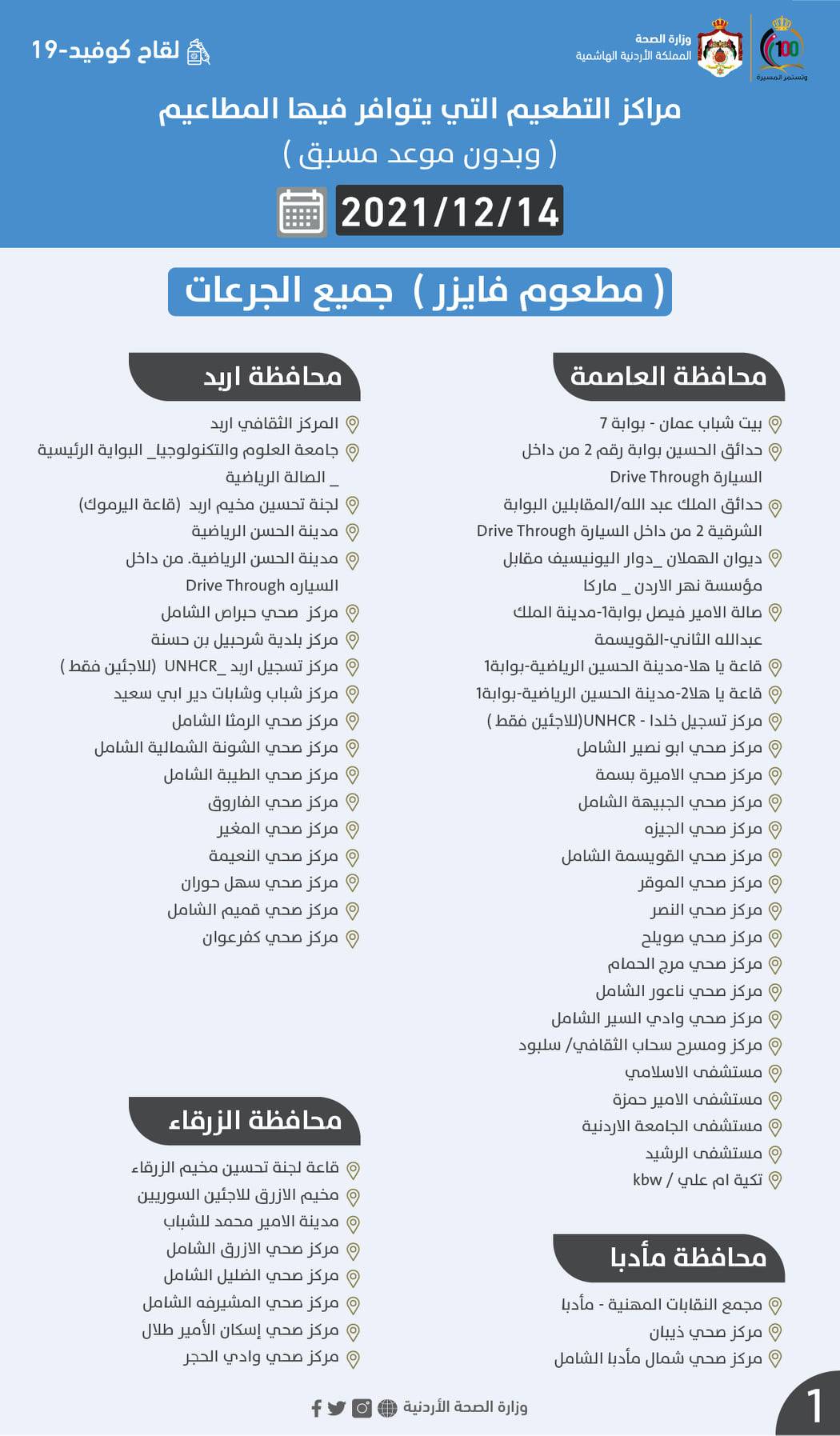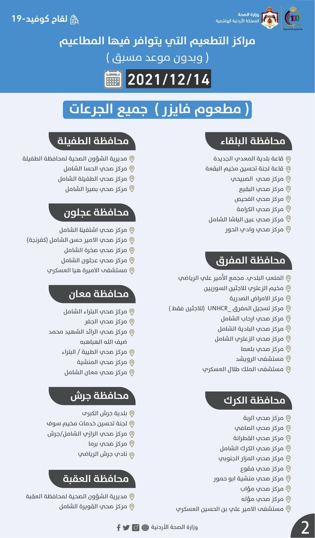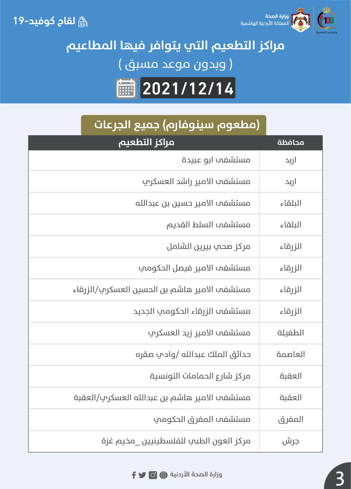 أعلنت وزارة الصحة عن مراكز التطعيم ليوم الثلاثاء التي يتوافر فيها المطاعيم (وبدون موعد مسبق) لجميع الجرعات.