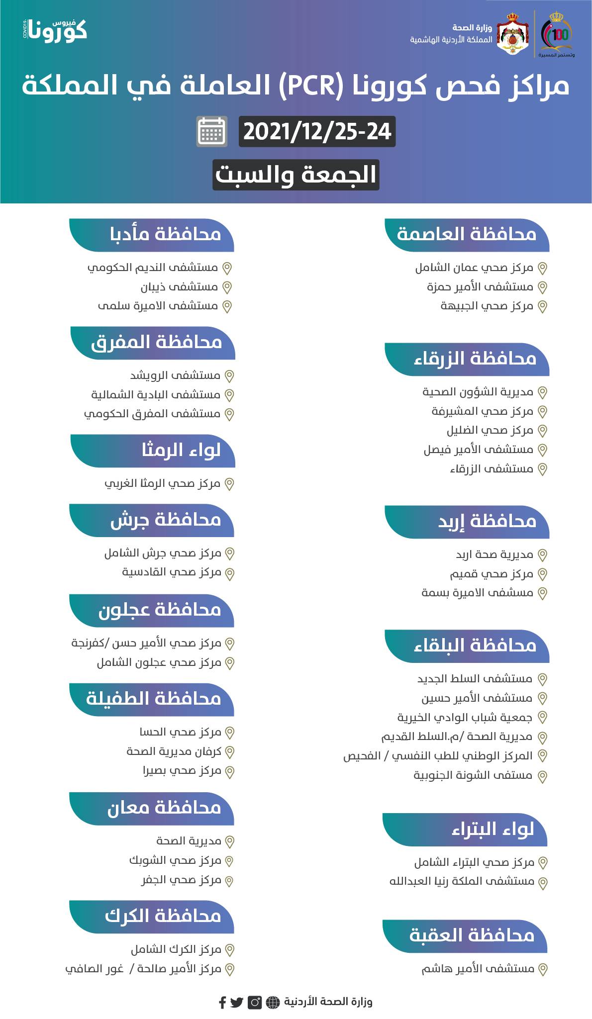أعلنت وزارة الصحة أسماء مراكز فحص كورونا (PCR) العاملة يومي الجمعة والسبت 24-25 /12/2021 في المملكة حسب التالي: