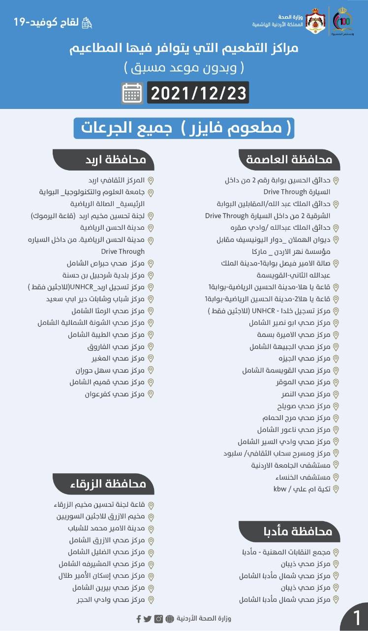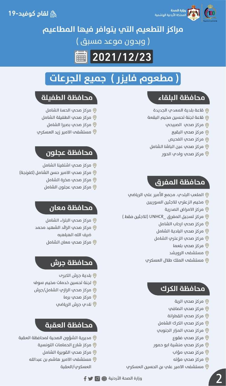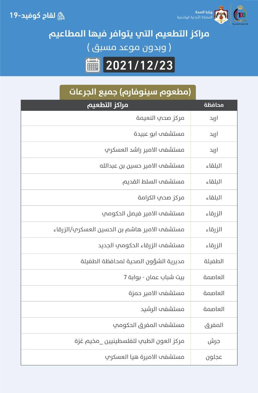أعلنت وزارة الصحة قائمة اسماء المراكز التي يتوافر فيها مطعوم فيروس كورونا (بدون موعد مسبق) بجميع الجرعات ليوم الجمعة 2021/12/24.
