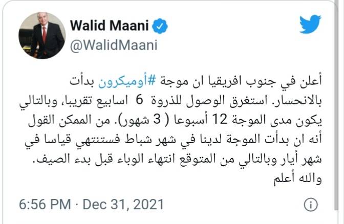 وغرد المعاني عبر تويتر  : أعلن في جنوب افريقيا ان موجة أوميكرون بدأت بالانحسار.