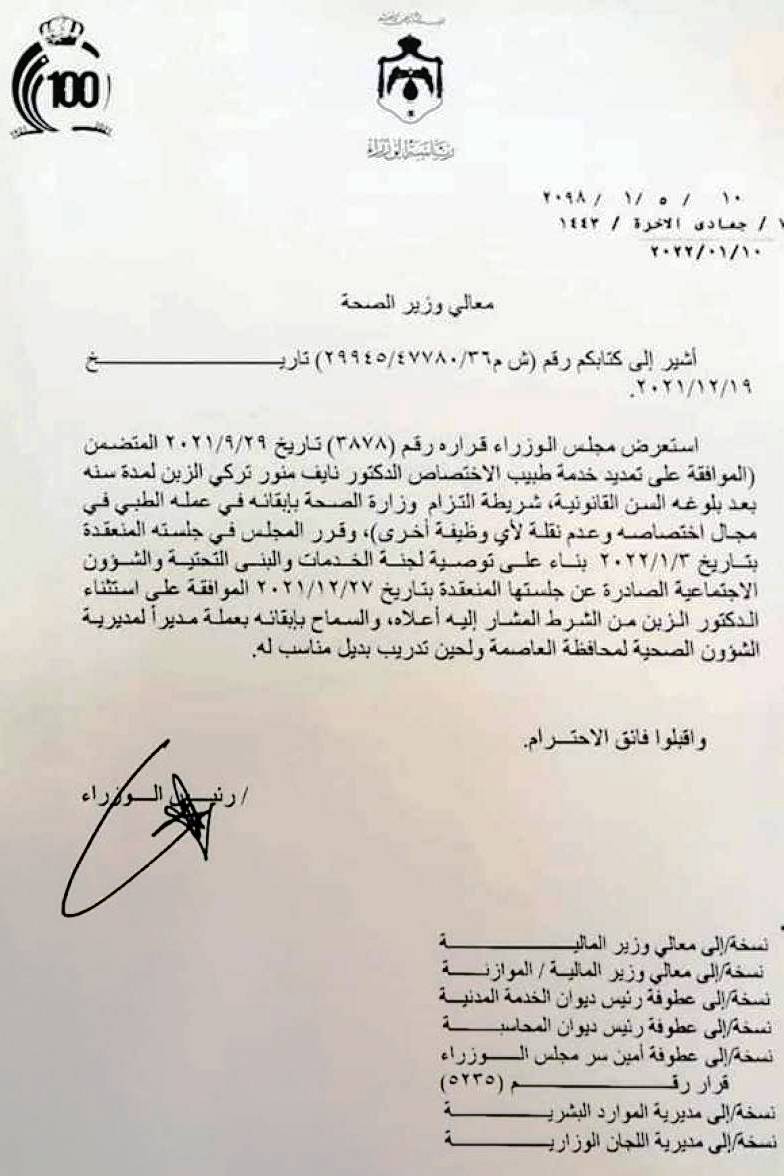 واشترط قرار التمديد التزام وزارة الصحة بإبقاء الدكتور الزبن في مجال عمله واختصاصه وعدم نقله لأي وظيفة أخرى كمدير لمديرية الشؤون الصحية لمحافظة العاصمة.