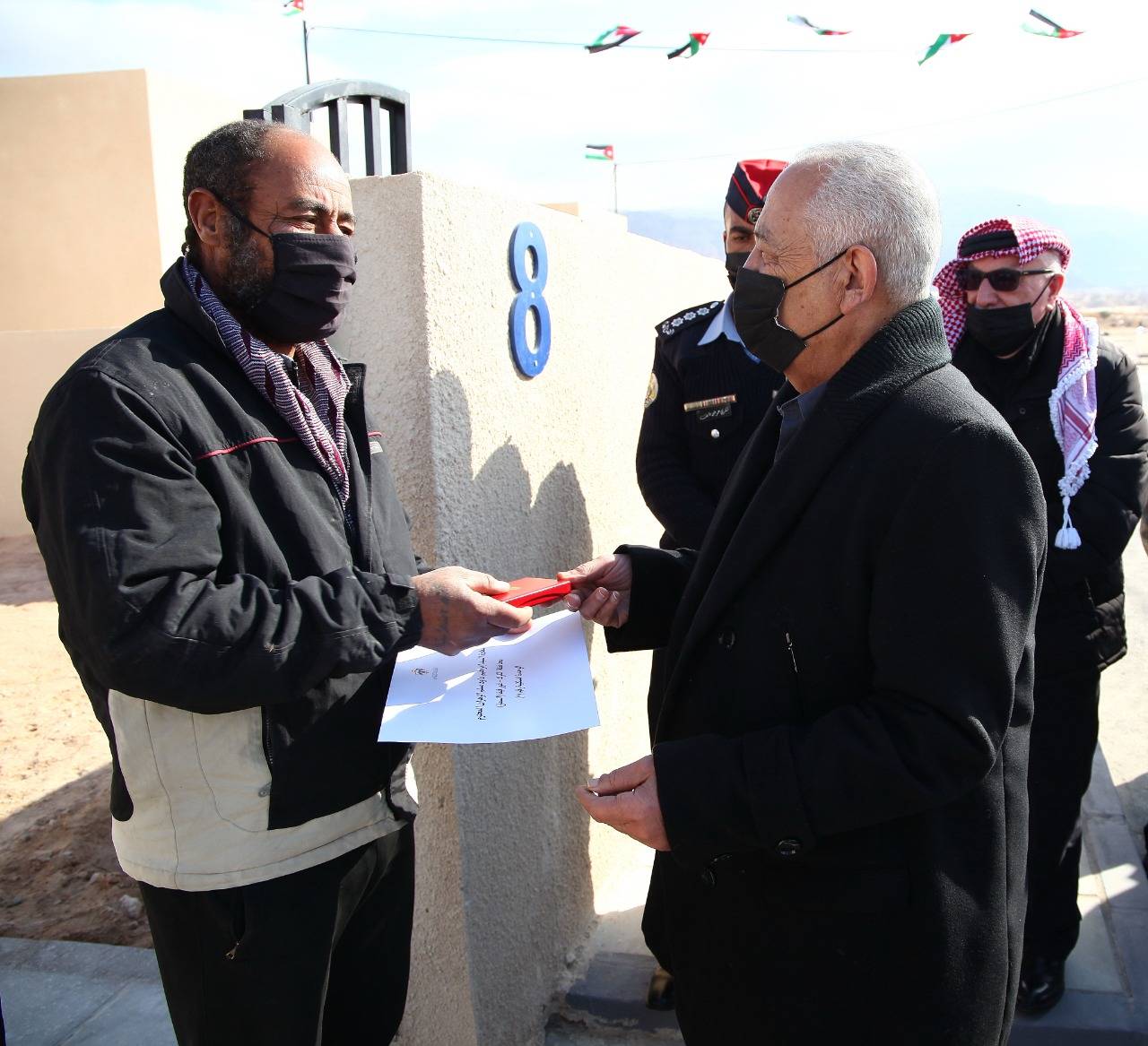 وسلّم رئيس الديوان الملكي الهاشمي، رئيس لجنة متابعة تنفيذ مبادرات جلالة الملك، يوسف حسن العيسوي، بحضور وزيري الأشغال العامة والإسكان المهندس يحيى الكسبي، والتنمية الاجتماعية أيمن المفلح، ومحافظ الكرك الدكتور محمد الفايز، مفاتيح (10) مساكن جديدة لأسر مستفيدة في منطقة غور السمار، ومفاتيح (5) مساكن لأسر مستفيدة في منطقة غور حديثة، بمحافظة الكرك، حيث صُمّمت المساكن وفقاً لأعلى المواصفات الهندسية والفنية.