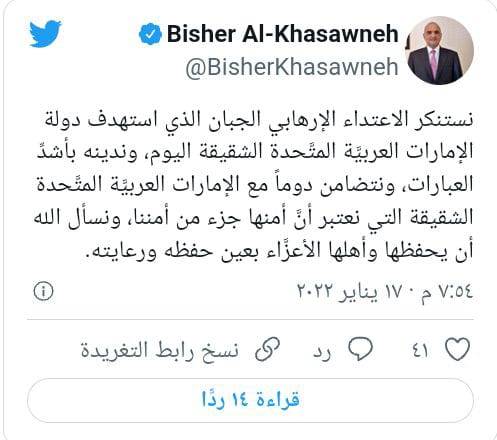 الخصاونة الاعتداء الإرهابي الجبان الذي استهدف دولة الإمارات العربيَّة المتَّحدة