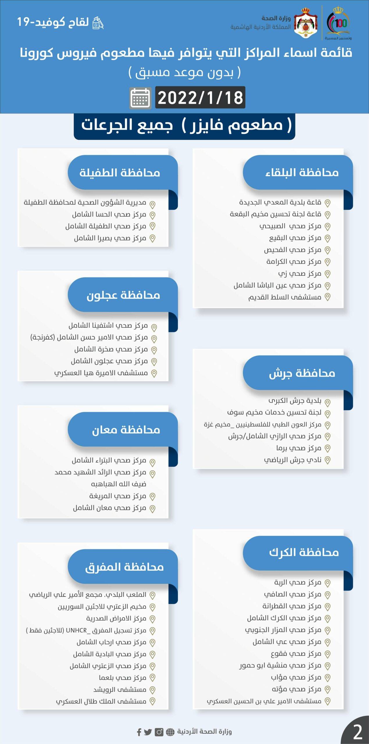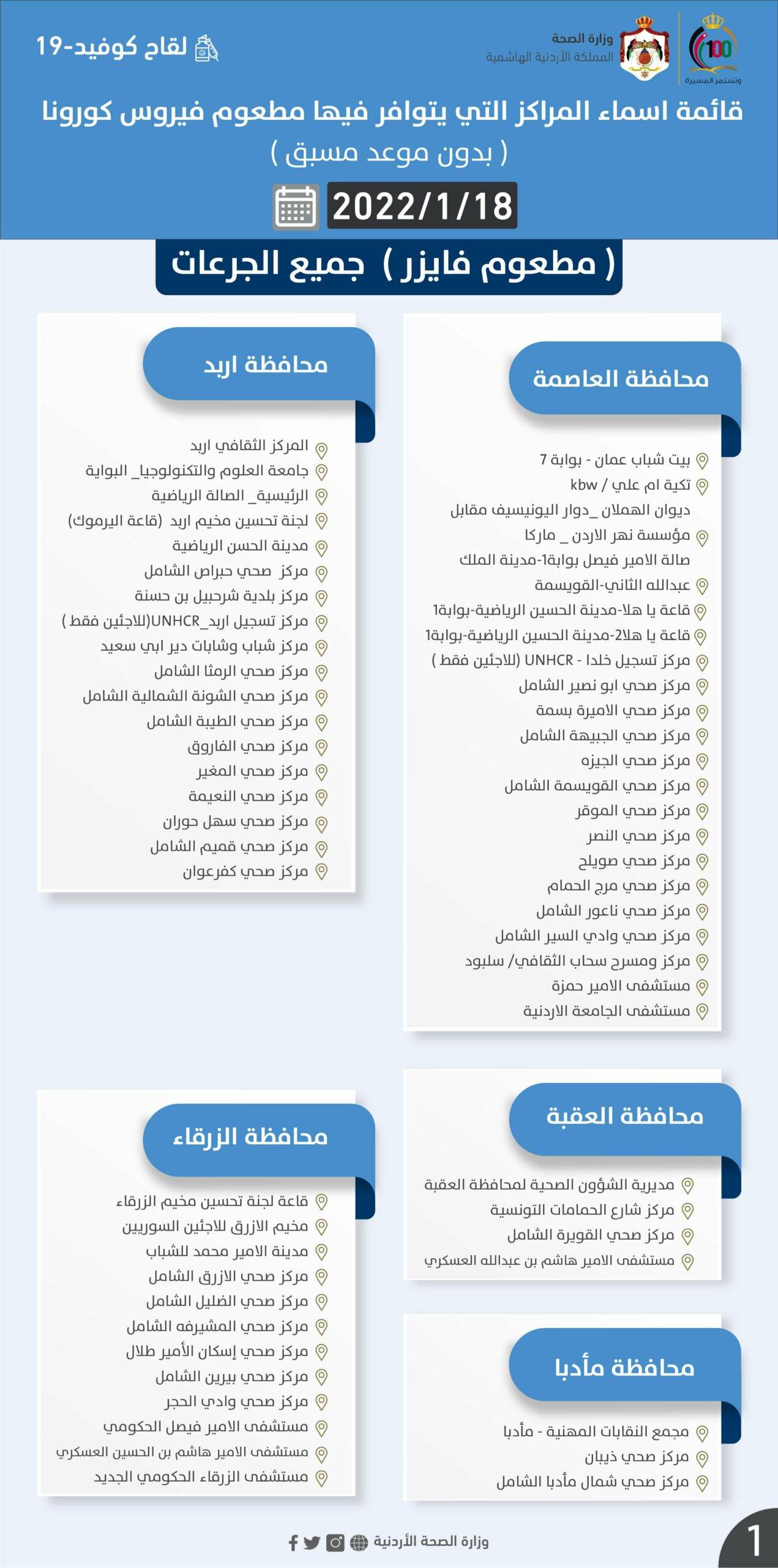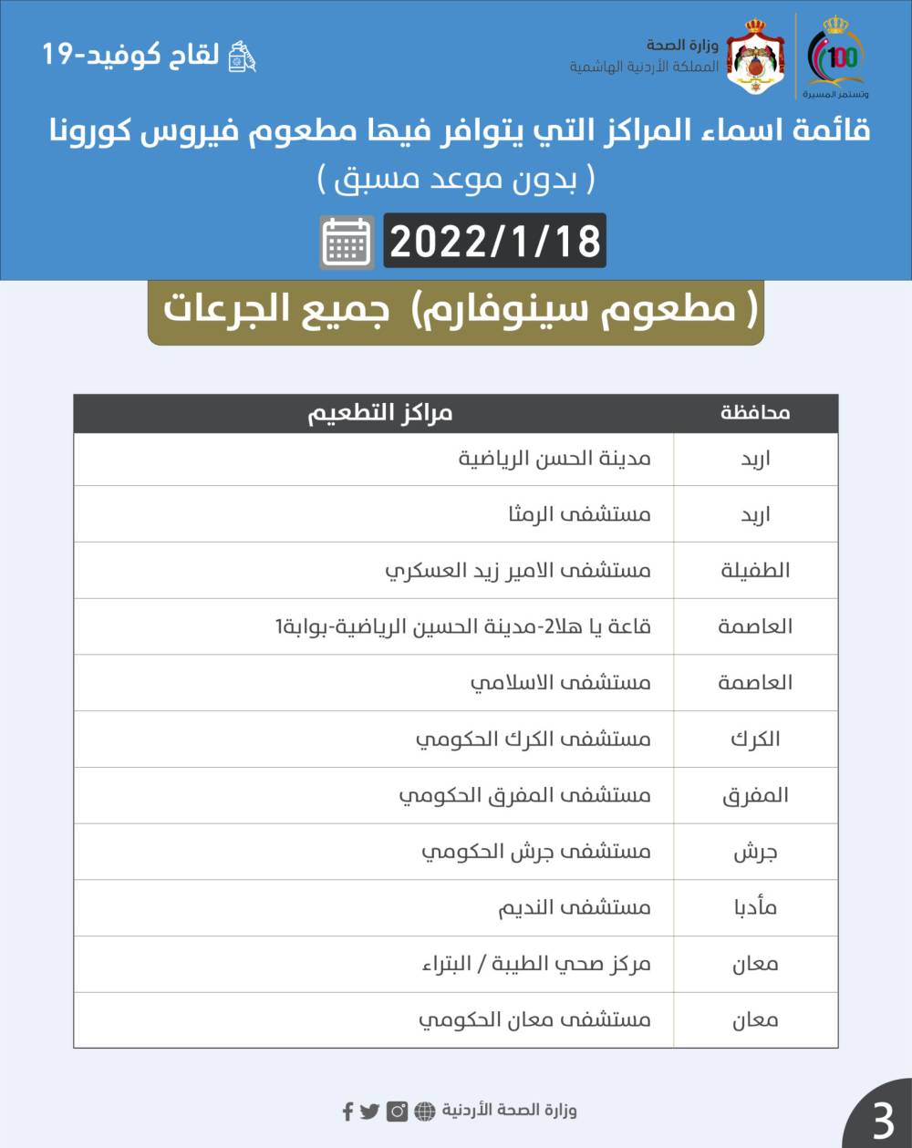 أعلنت وزارة الصحة قائمة أسماء المراكز التي يتوافر فيها مطعوم فيروس كورونا (بدون موعد مسبق) بجميع الجرعات ليوم الثلاثاء الموافق 2022/1/18.