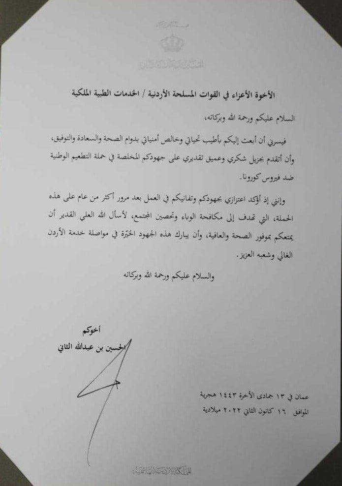 وإنني إذ أؤكد اعتزازي بجهودكم وتفانيكم في العمل بعد مرور أكثر من عام على هذه الحملة، التي تهدف إلى مكافحة الوباء وتحصين المجتمع، لأسأل الله العلي القدير أن يمتعكم بموفور الصحة والعافية، وأن يبارك هذه الجهود الخيّرة في مواصلة خدمة الأردن الغالي وشعبه العزيز).