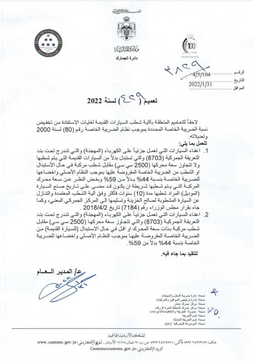 ووفق التعميم، طلب مدير عام الجمارك العمل على إعفاء المركبات التي تعمل جزيئا على الكهرباء (المهجنة) والتي تستبدل بدلا من السيارات القديمة التي يتم شطبها ولا تتجاوز سعة محركها 2500 سي سي مقابل شطب مركبة في حال الاستبدال أو الشطب من الضريبة الخاصة المفروضة عليها بموجب النظام الأصلي وإخضاعها للضريبة الخاصة 44% بدلا من 59% وبغض النظر عن سعة محرك المركبة التي تم شطبها.