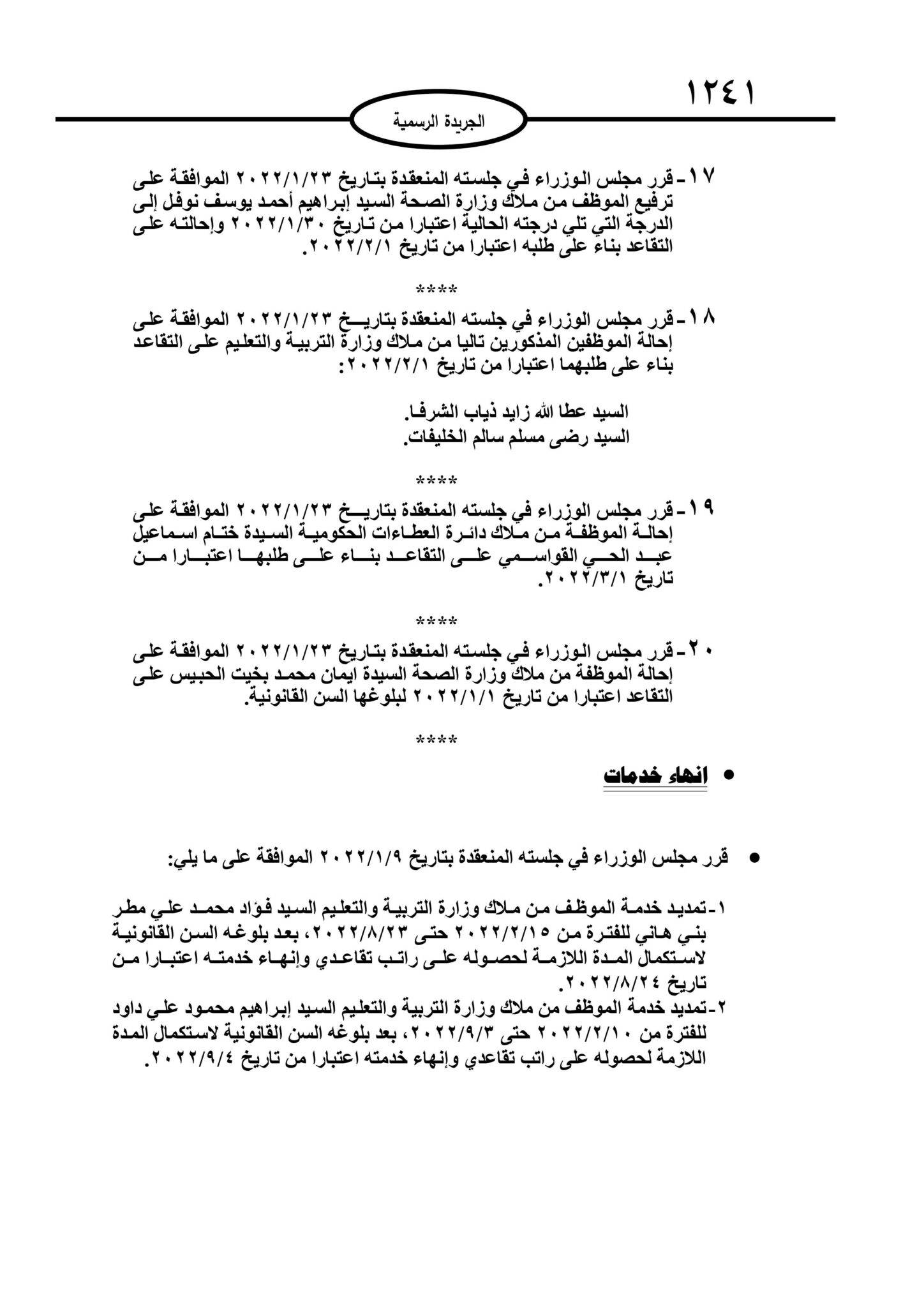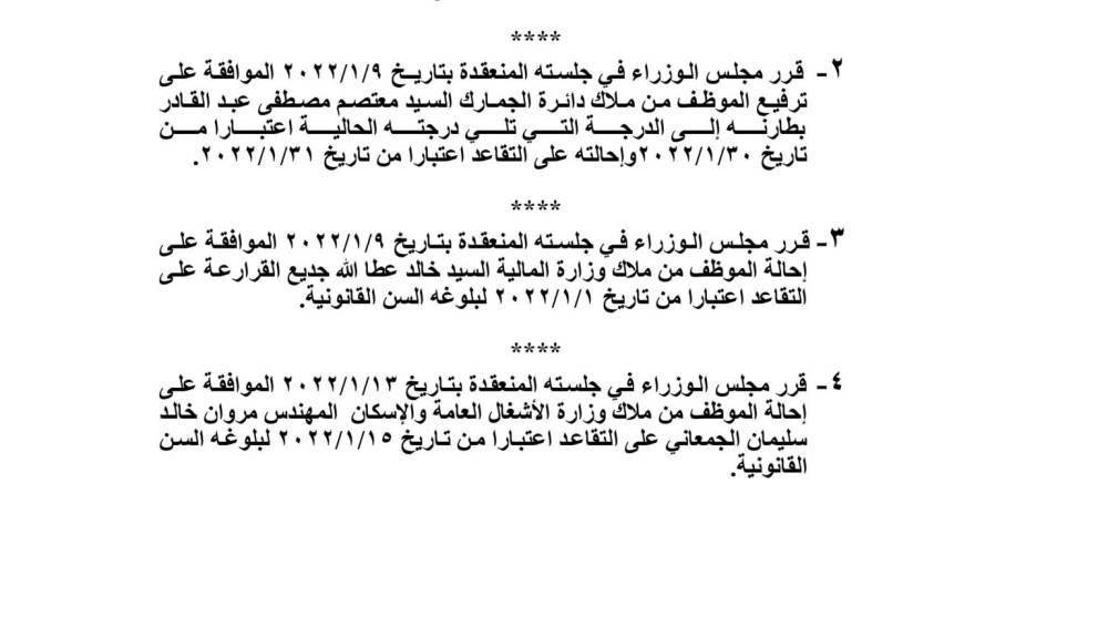 قرر مجلس الوزراء إحالة موظفين من ملاك الوزارات على التقاعد وإنهاء خدمات آخرين.