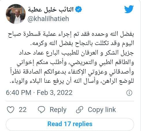 فقد تم إجراء عملية قسطرة صباح اليوم وقد تكللت بالنجاح بفضل الله وكرمه"