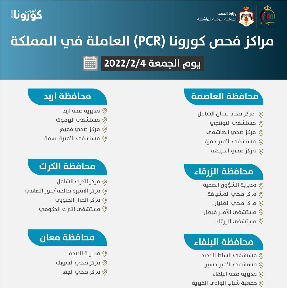 اعلنت وزارة الصحة ، عن مراكز فحص كورونا (PCR) العاملة يوم الجمعة 2022/2/4 في المملكة.