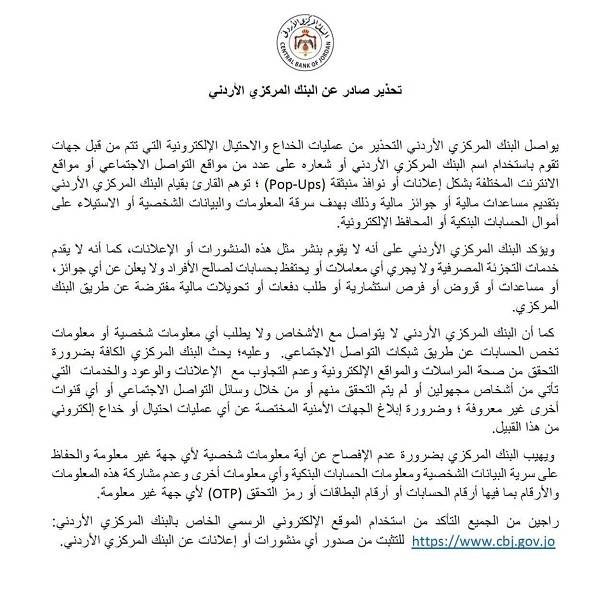 حذر البنك المركزي الأردني الجمعة من عمليات الخداع والاحتيال الإلكتروني التي تتم باستخدام اسمه أو شعاره.