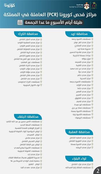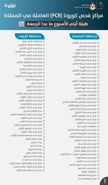 نشرت وزارة الصحة مراكز فحص كورونا(PCR) العاملة طيلة أيام الأسبوع ما عدا يوم الجمعة في المملكة حسب التالي: