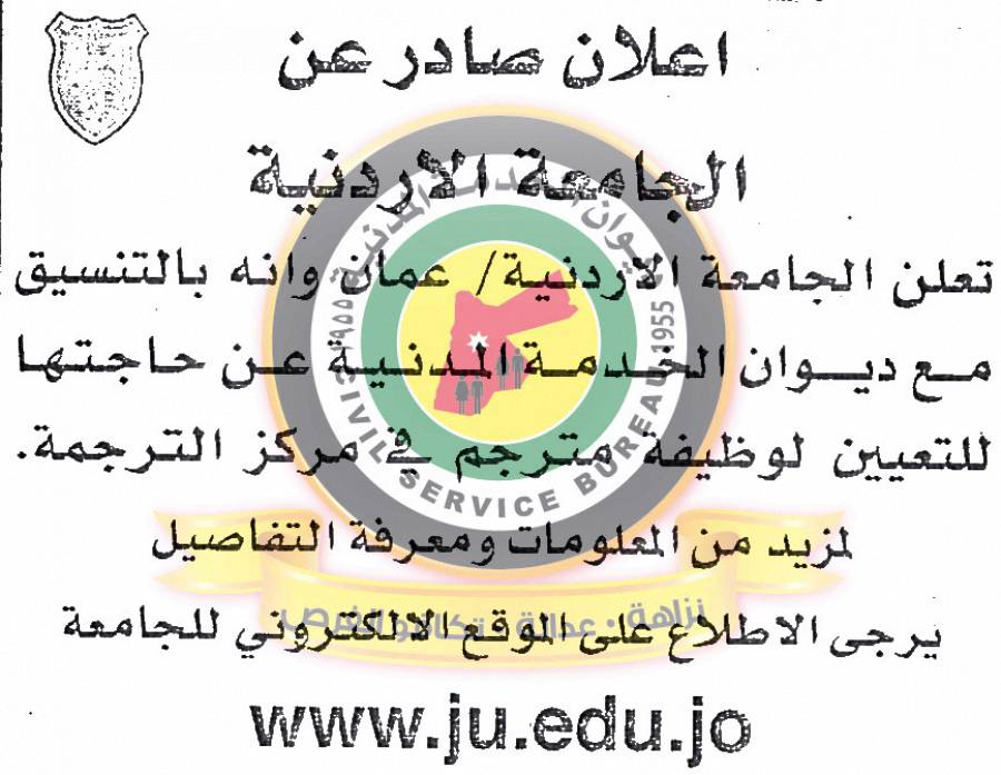 تعلن الجامعة الأردنية /عمان وبالتنسيق مع ديوان الخدمة المدنية عن التعيين في وظيفة مترجم، وفقا للشروط والتفاصيل التالية
