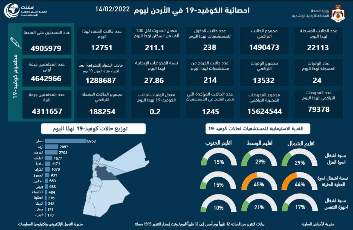 24 وفاة و22113 إصابة جديدة بكورونا في الأردن ونسبة الفحوصات الإيجابية 27.86%