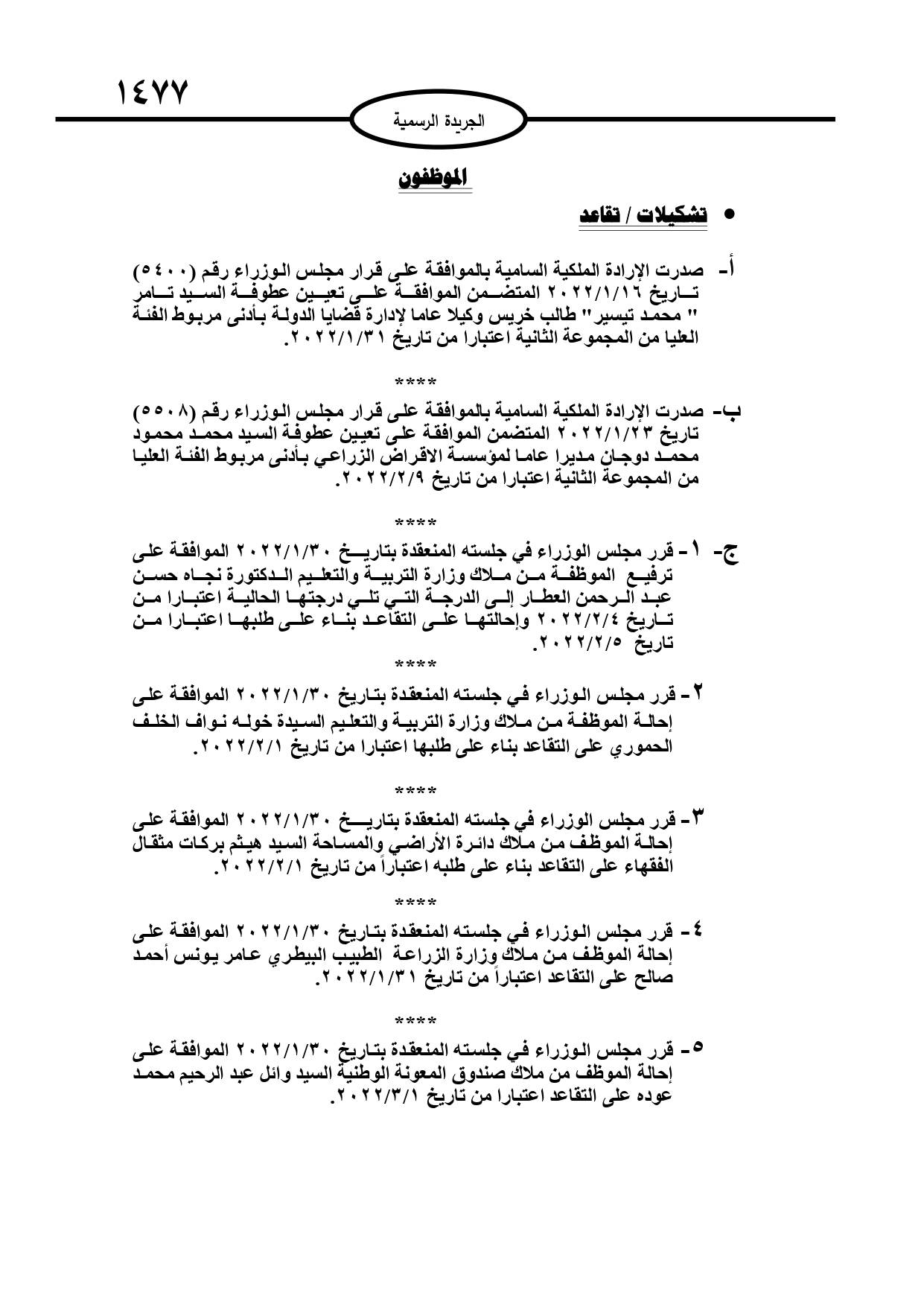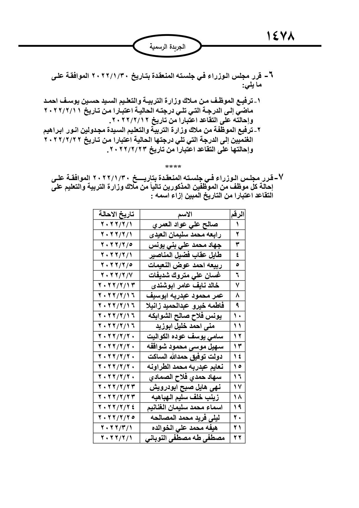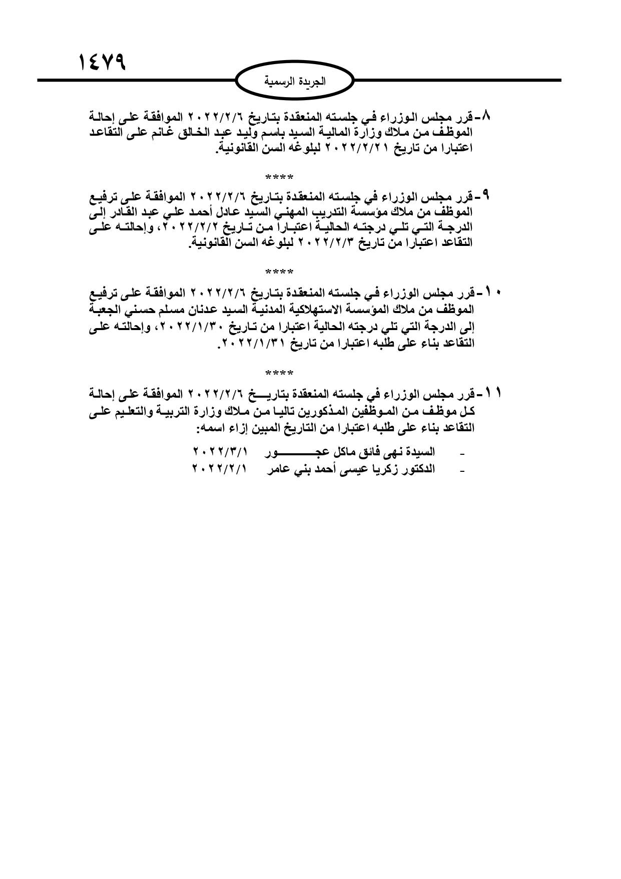وقرر مجلس الوزراء، إحالة عدد من الموظفين في وزارات ومؤسسات حكومية الى التقاعد وانهاء خدمات آخرين.