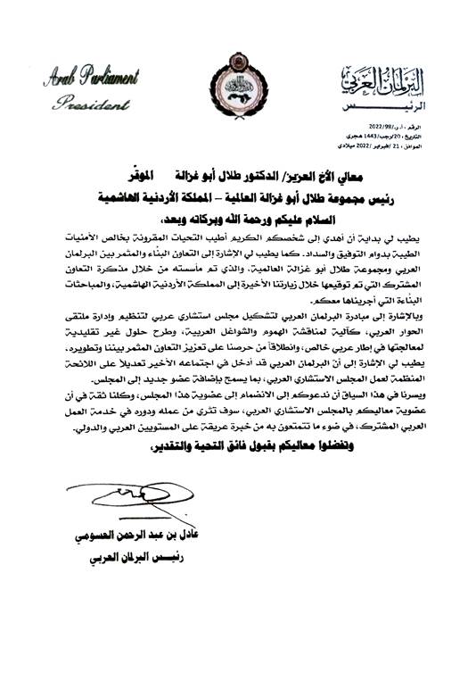 وكان سعادة السيد عادل بن عبدالرحمن العسومي رئيس البرلمان العربي قد أكد في دعوته للدكتور أبوغزاله للانضمام للمجلس، أن المجلس جاء بهدف تنظيم وإدارة ملتقى الحوار العربي كآلية لمناقشة الهموم العربية وطرح حلول غير تقليدية لمعالجتها في إطار عربي، مشدداً على ثقته بأن انضمام الدكتور أبوغزاله "سيثري من عمل المجلس ودوره في خدمة العمل العربي المشترك في ضوء ما يتمتع به الدكتور أبوغزاله من خبرة عريقة على المستويين العربي والدولي