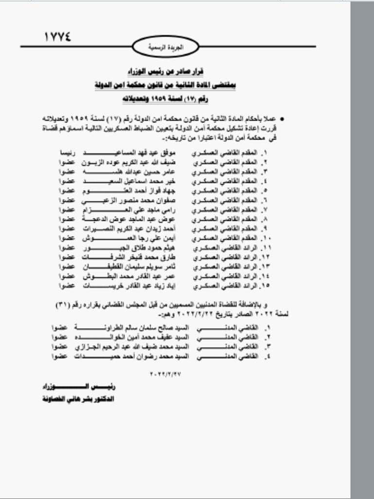 وتقرر تعيين المقدم القاضي العسكري، موفق المساعيد رئيساً، وعضوية كل من ..