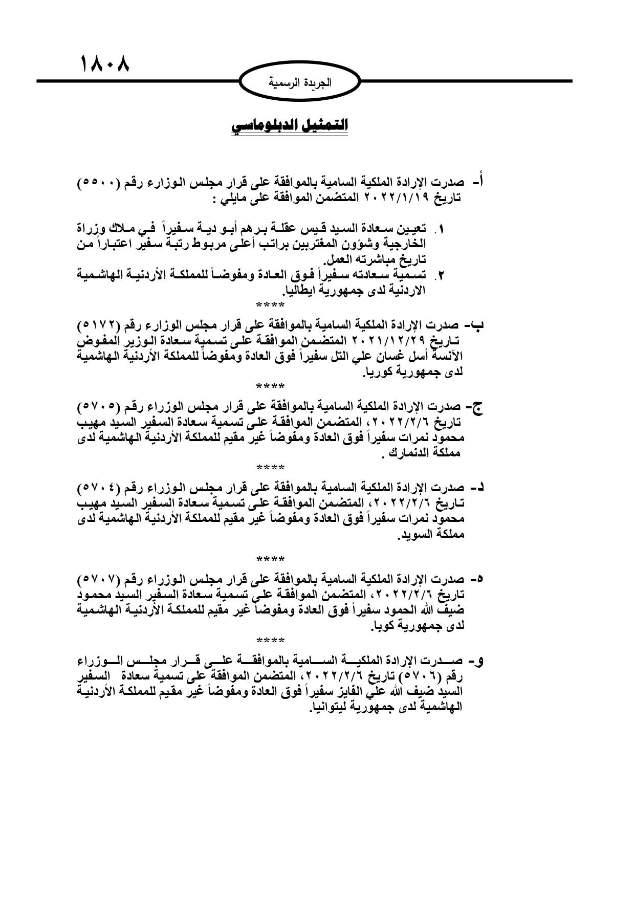 من تاريخ مباشرته العمل، وتسميته سفيرا فوق العادة ومفوضا للمملكة الأردنية