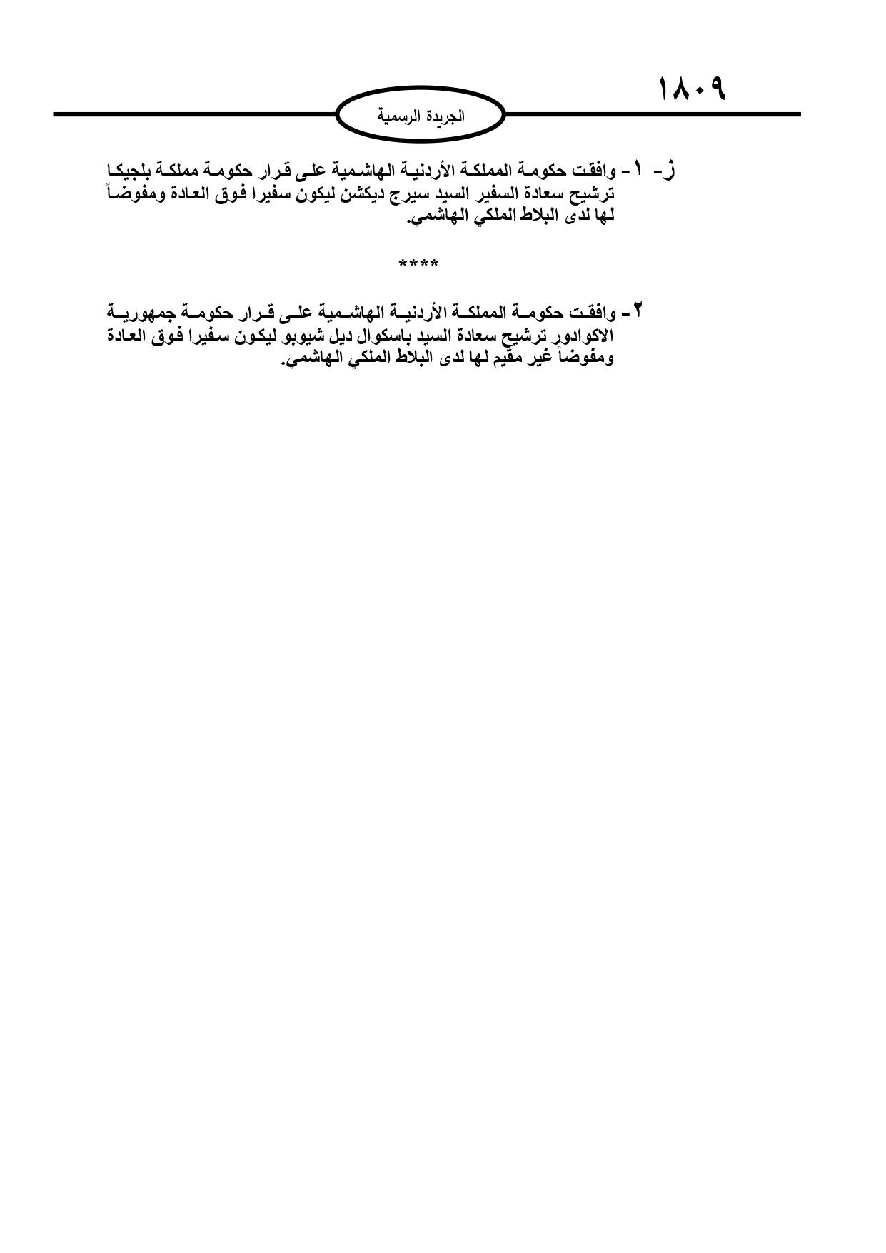 الهاشمية على قرار حكومة مملكة بلجيكا ترشيح السفير سيرج ديكشن ليكون سفيرا فوق