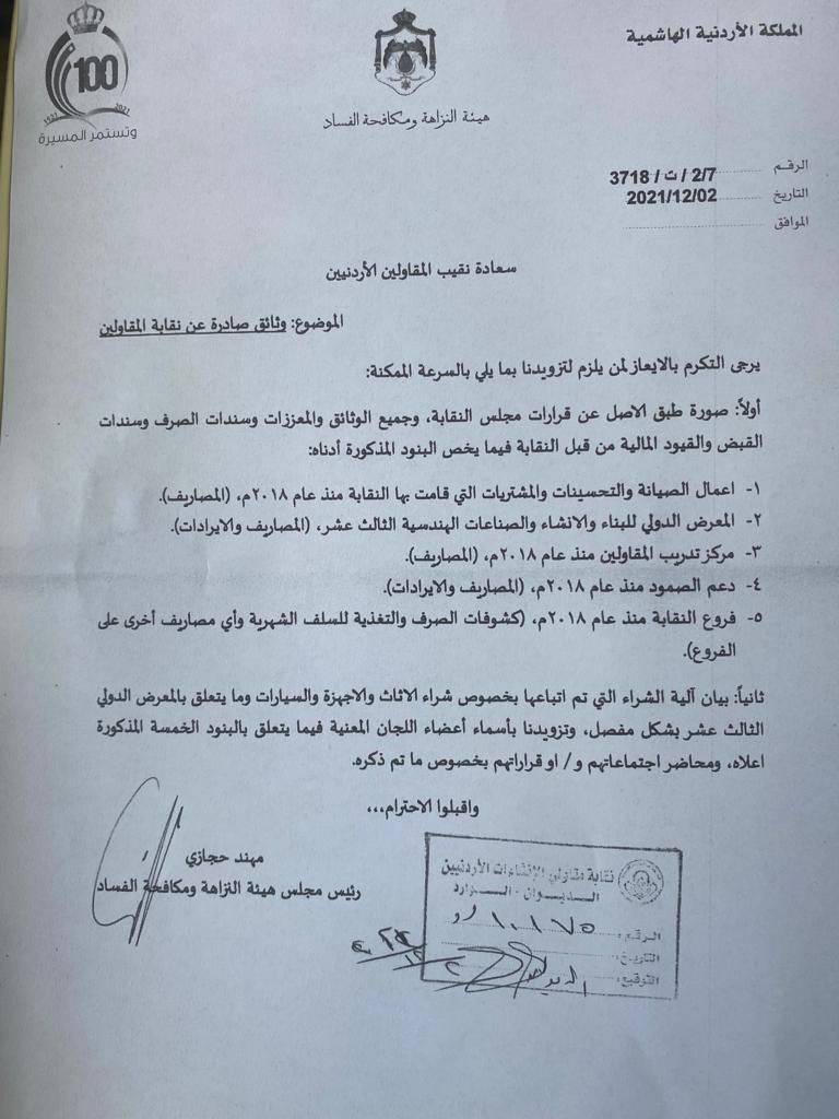 وجهت هيئة النزاهة ومكافحة الفساد ,كتاباً لنقابة المقاولين الاردنيين تطالب بالتحقيق في بعض الوثائق والاوامر والقرارات الصادرة عن مجلس النقابة .