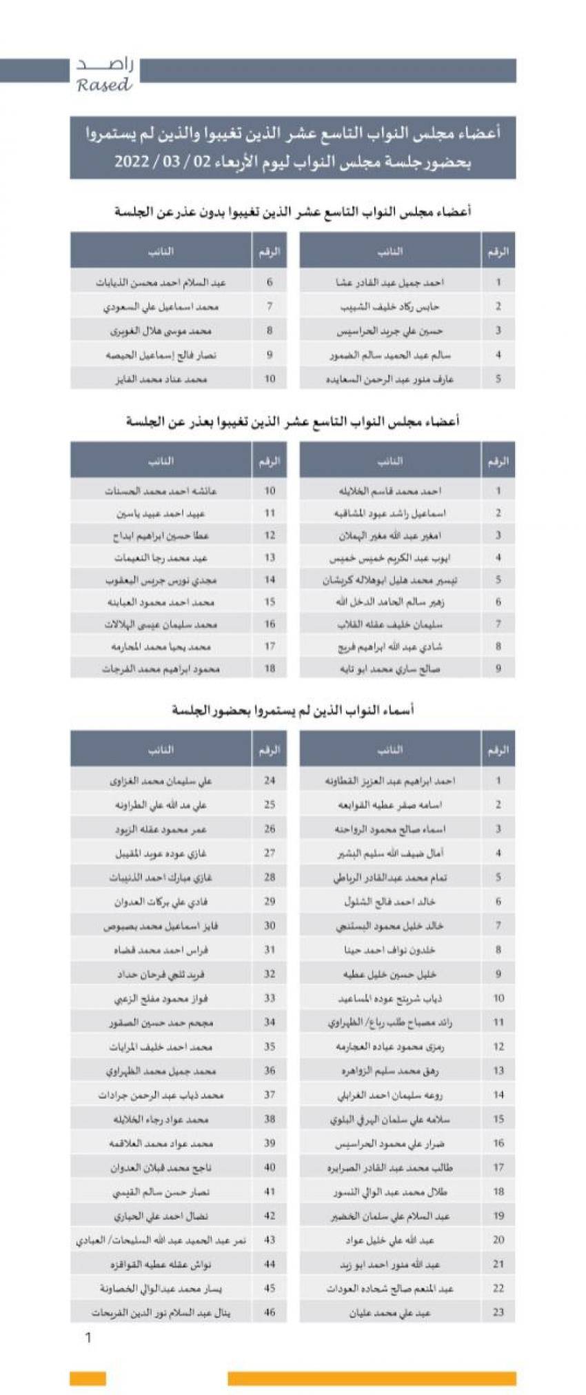 وأسماء النواب المتغيبين بدون عذر من خلال الجداول المرفقة.