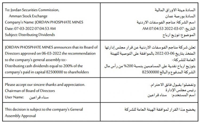 وقالت مناجم الفوسفات في افصاح إلى هيئة الاوراق المالية - بورصة عمّان، إن مجلس إدارتها قرر الموافقة على التوصية للهيئة العامة للشركة بتوزيع أرباح نقدية على المساهمين بنسبة 200% من رأس مال الشركة المدفوع والبالغ 82 مليونا و500 ألف.