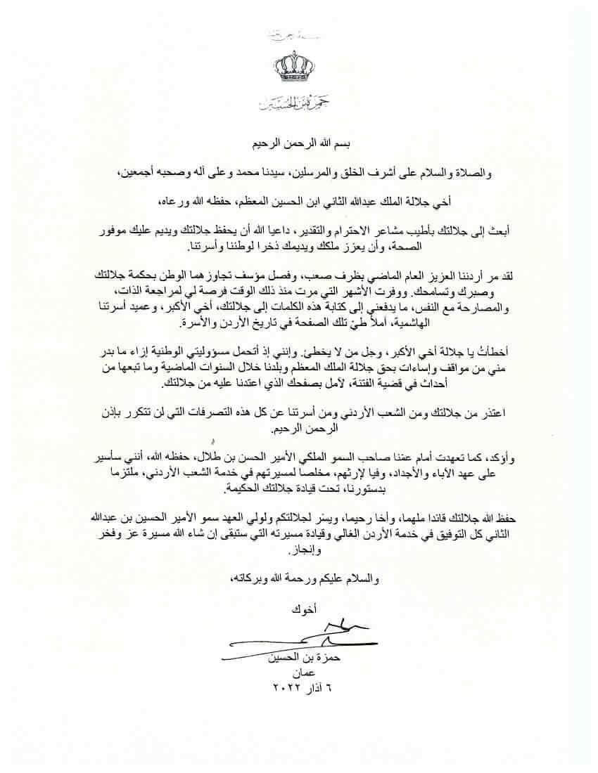 لقد مرّ أردننا العزيز العام الماضي بظرف صعب، وفصل مؤسف تجاوزهما الوطن بحكمة جلالتك وصبرك وتسامحك. ووفرت الأشهر التي مرت منذ ذلك الوقت فرصة لي لمراجعة الذات، والمصارحة مع النفس، ما يدفعني إلى كتابة هذه الكلمات إلى جلالتك، أخي الأكبر، وعميد أسرتنا الهاشمية، آملاً طيّ تلك الصفحة في تاريخ الأردن والأسرة.