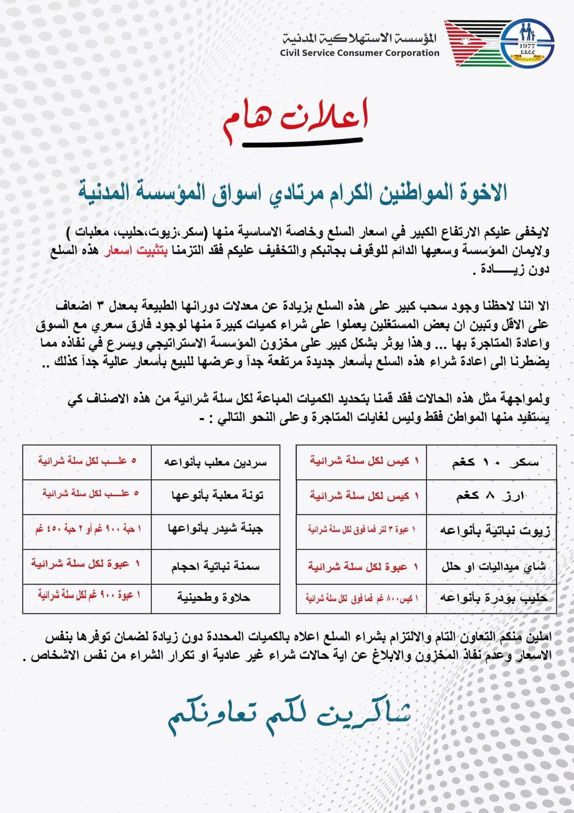 وقالت المؤسسة عبر الفيسبوك: "الأخوة المواطنين الكرام مرتادي أسواق المؤسسة المدنية لا يخفى عليكم الارتفاع الكبير في أسعار السلع وخاصة الأساسية منها (سكر، زيوت، حليب، معلبات) ولإيمان المؤسسة وسعيها الدائم للوقوف بجانبكم والتخفيف عليكم فقد التزمنا بتثبيت أسعار هذه السلع دون زيادة"