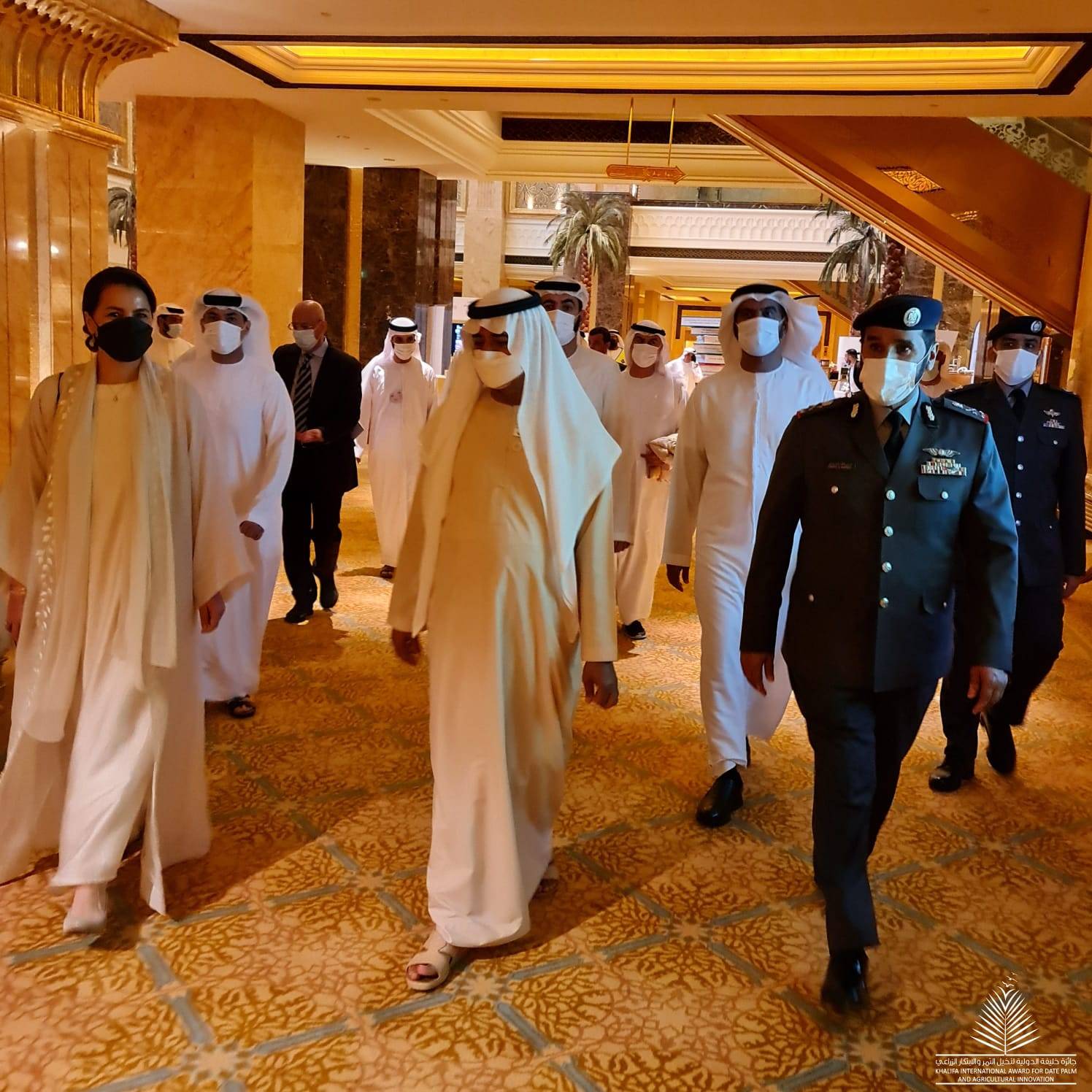تحت رعاية صاحب السمو الشيخ خليفة بن زايد آل نهيان، رئيس الدولة "حفظه الله"، شهد معالي الشيخ نهيان مبارك آل نهيان، وزير التسامح والتعايش، رئيس مجلس أمناء جائزة خليفة الدولية لنخيل التمر والابتكار الزراعي ظهر يوم الاثنين 14 مارس 2022 حفل تكريم الفائزين بالجائزة في دورتها الرابعة عشرة، بمشاركة معالي الدكتور "شو دونيو" مدير عام منظمة الأغذية والزراعة للأمم المتحدة (الفاو) ومعالي مريم بنت محمد سعيد حارب المهيري وزيرة التغير المناخي والبيئة، ومعالي المهندس خالد الحنيفات وزير الزراعة بالمملكة الأردنية الهاشمية، ومعالي السيد محمد مرزوق القصير وزير الزراعة واستصلاح الأراضي بجمهورية مصر العربية، ومعالي الدكتور أبو بكر عمر البشري، وزير الزراعة والغابات بجمهورية السودان، ومعالي رياض محمد يوسف عطاري، وزير الزراعة بدولة فلسطين، ومعالي معالي الدكتور محمد حسان، وزير الزراعة واستصلاح الأراضي بالجمهورية العربية السورية، ومعالي حمد عبد الرزاق المريني، وزير الزراعة والثروة الحيوانية بدولة ليبيا، وسعادة المهندس لويس لحود، ممثل وزير الزراعة بالجمهورية اللبنانية، وسعادة هاشم بن سالم ممثل وزير الزراعة التونسي، وسعادة أحمد بن صالح عيادة الخمشي، ممثل وزير الزراعة والمياه والبيئة بالمملكة العربية السعودية، وسعادة الدكتورعبد العزيز محمد عبد الكريم، ممثل وزير الزراعة بمملكة البحرين.وكافة أعضاء مجلس الأمناء، والفائزين والمكرمين بالجائزة وحشد كبير من المختصين والمهتمين بزراعة النخيل وإنتاج التمور والابتكار الزراعي.