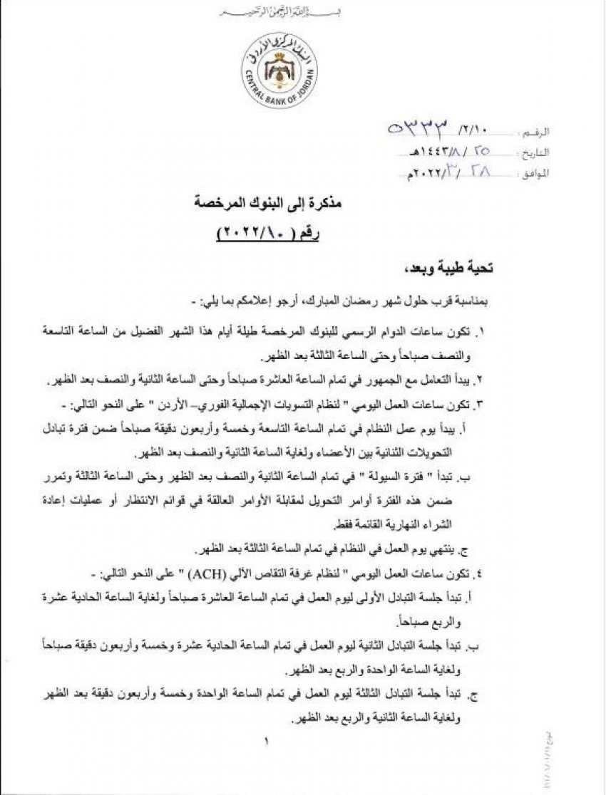 أصدر محافظ البنك المركزي الدكتور عادل شركس بلاغا حدد فيه دوام البنك المركزي والبنوك العاملة في المملكة خلال شهر رمضان المبارك.