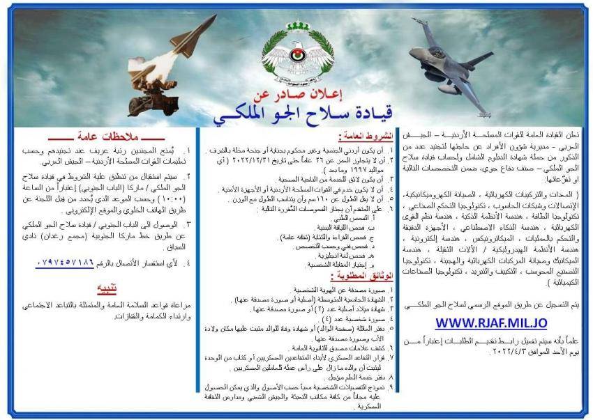 أعلنت القيادة العامة للقوات المسلحـــة الأردنيـــة – الجيـش العربي - مديرية شؤون الأفراد عن حاجتها لتجنيد عدد من الذكور من حملة شهادة الدبلوم الشامل ولحساب قيادة سلاح الجو الملكي – صنف دفاع جوي, ضمن التخصصات التالية او تفرّعاتها: