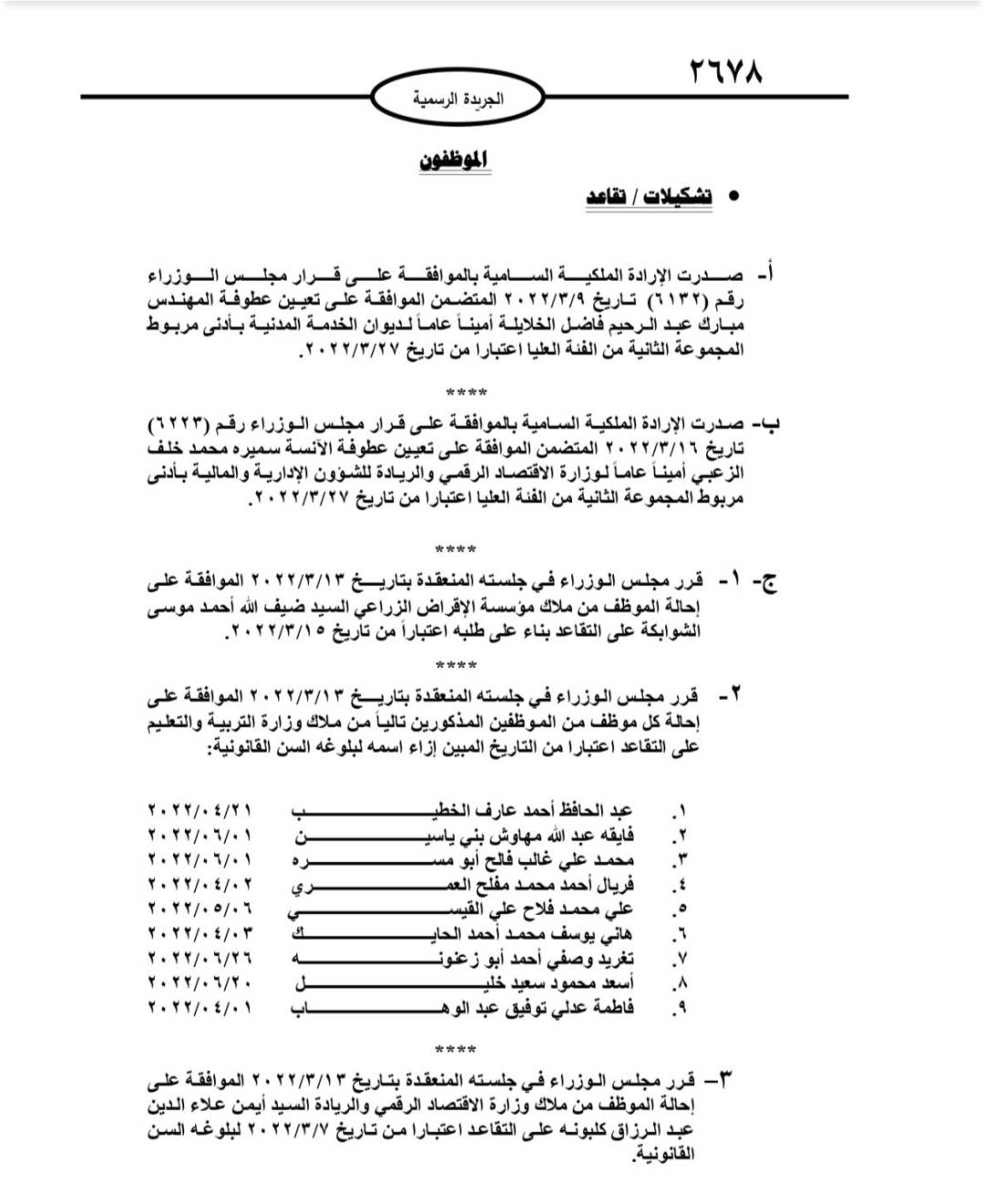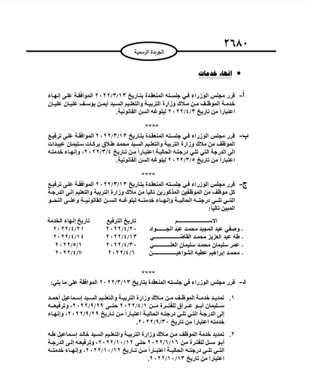 مجلس الوزراء، إحالة عدد من الموظفين في وزارات ومؤسسات حكومية الى التقاعد وانهاء