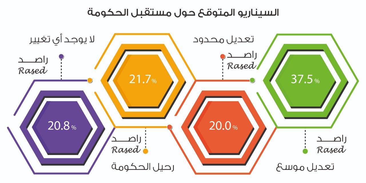 وبما يتعلق بالسيناريو المتوقع حول مستقبل الحكومة، فقد أظهر الاستطلاع أن 37.5% من النواب يتوقعون حدوث تعديل موسع، ويتوقع 20.0% حدوث تعديل محدود، فيما بلغت نسبة النواب الذين يتوقعون رحيل الحكومة هي 21.7%، وتوقع 20.8% من النواب عدم حدوث اي تغيير.