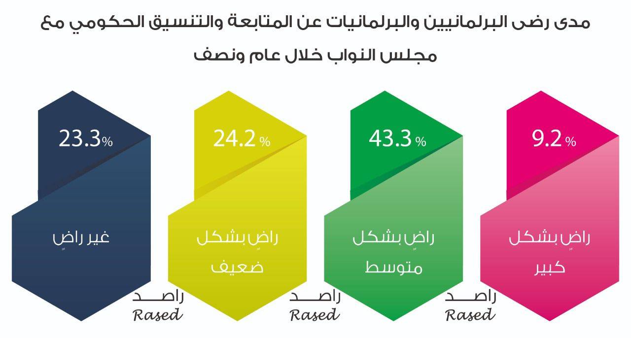 وحول رضى النواب عن المتابعة والتنسيق الحكومي مع مجلس النواب خلال عام ونصف، قال 9.2% من النواب أنهم راضون بشكل كبير، وما نسبته 43.3% راضون بشكل متوسط، و24.2% راضون بشكل ضعيف، فيما كانت نسبة النواب غير الراضون عن مدى المتابعة والتنسيق الحكومي هي 23.2%.