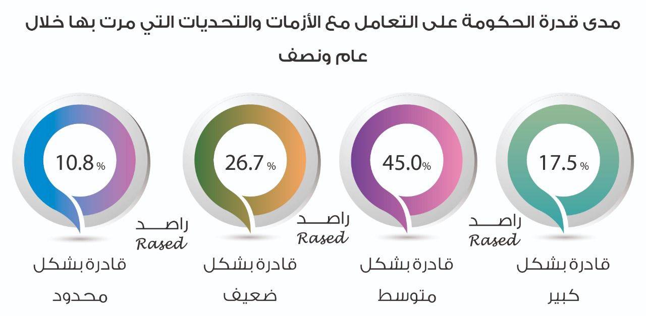 وعلى صعيد آراء النواب حول تعامل الحكومة مع الأزمات والتحديات التي مرت بها، قال 17.5% من النواب أن الحكومة كانت قادرة بشكل كبير، فيما قال 45% أنها قادرة بشكل متوسط، و26.7% قالوا أنها قادرة بشكل ضعيف، و10.8% قالوا أنها كانت قادرة بشكل محدود، وبخصوص ملف التشغيل والبطالة فقد تبين أن 0.8% من النواب راضون بشكل كبير، و10.8% راضون بشكل متوسط، و30.8% منهم راضون بشكل ضعيف.
