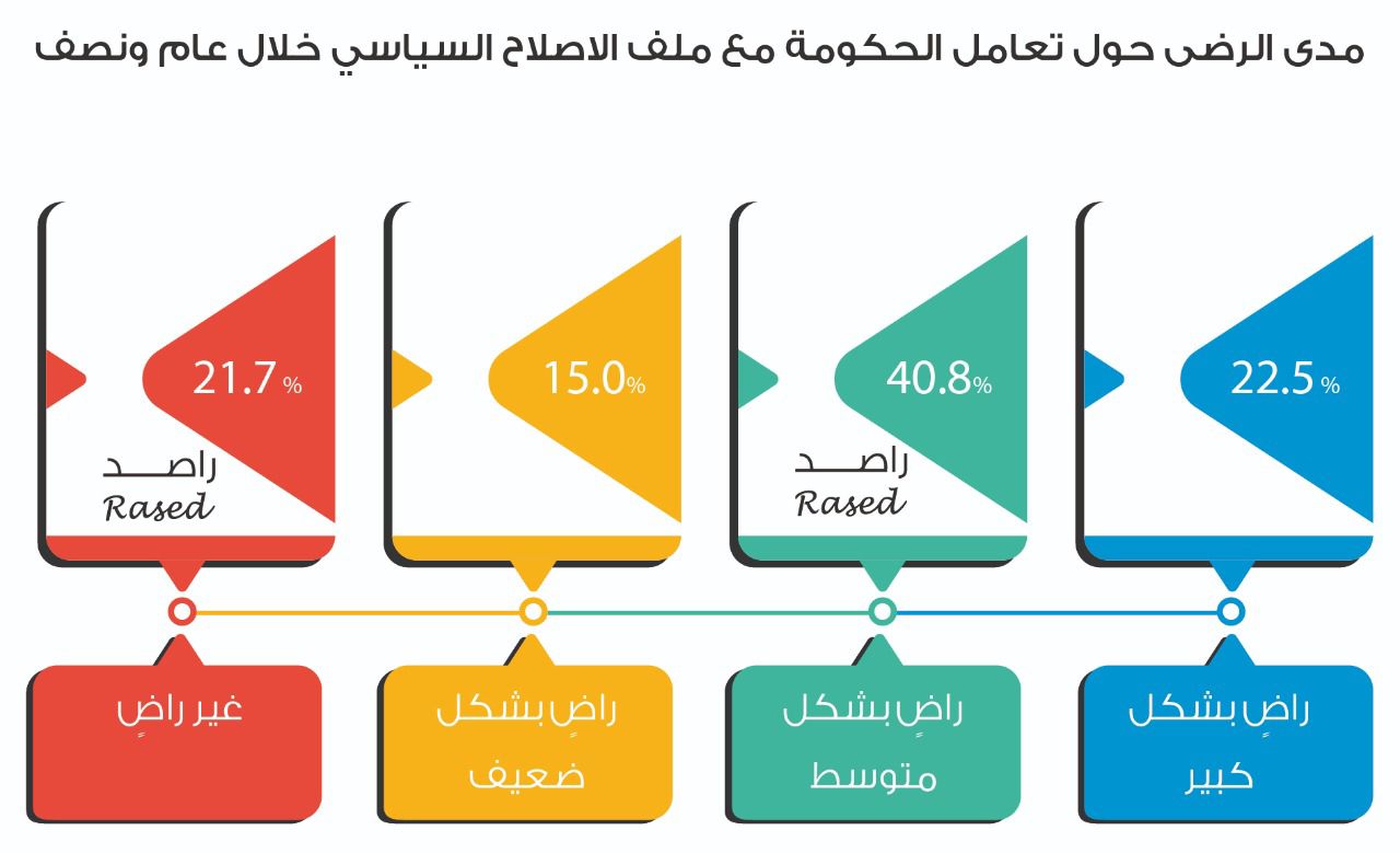 أما رضى النواب حول تعامل الحكومة مع ملف الإصلاح السياسي، تبين أن 22.5% راضون بشكل كبير، بينما 40.8% راضون بشكل متوسط، و15% راضون بشكل ضعيف، و21.7% غير راضون.