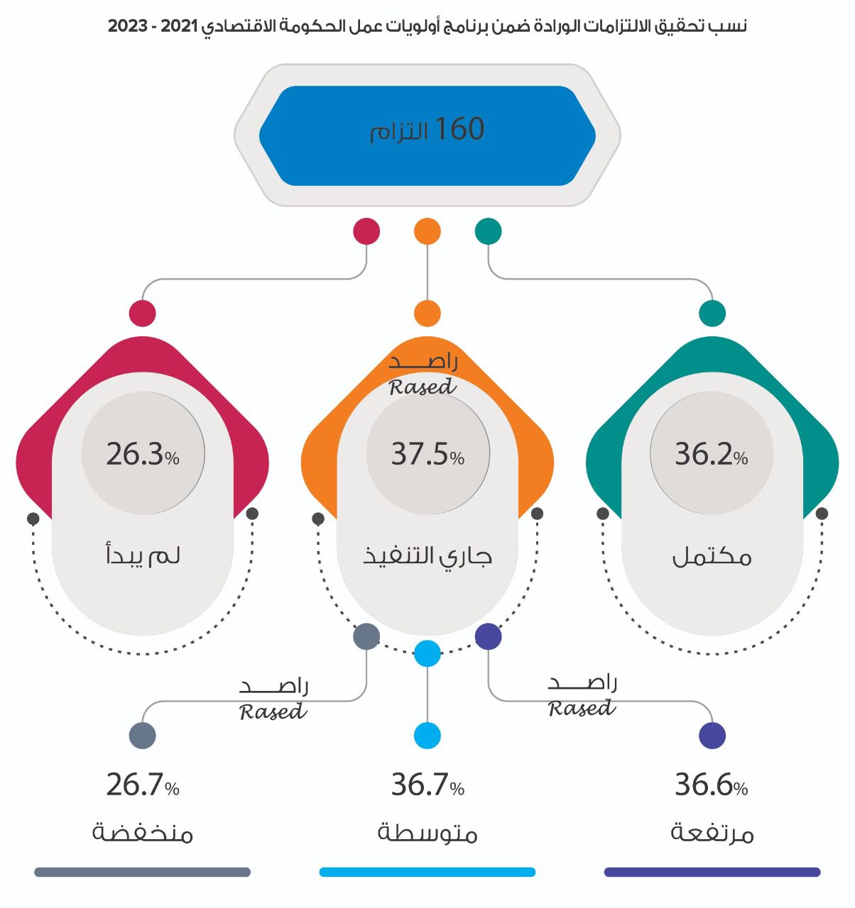 * 160 التزاماً ضمن برنامج الحكومة الاقتصادي اكتمل منها 36.2%، و37.5% جاري تنفيذها، و 26.3% لم يبدأ العمل بها