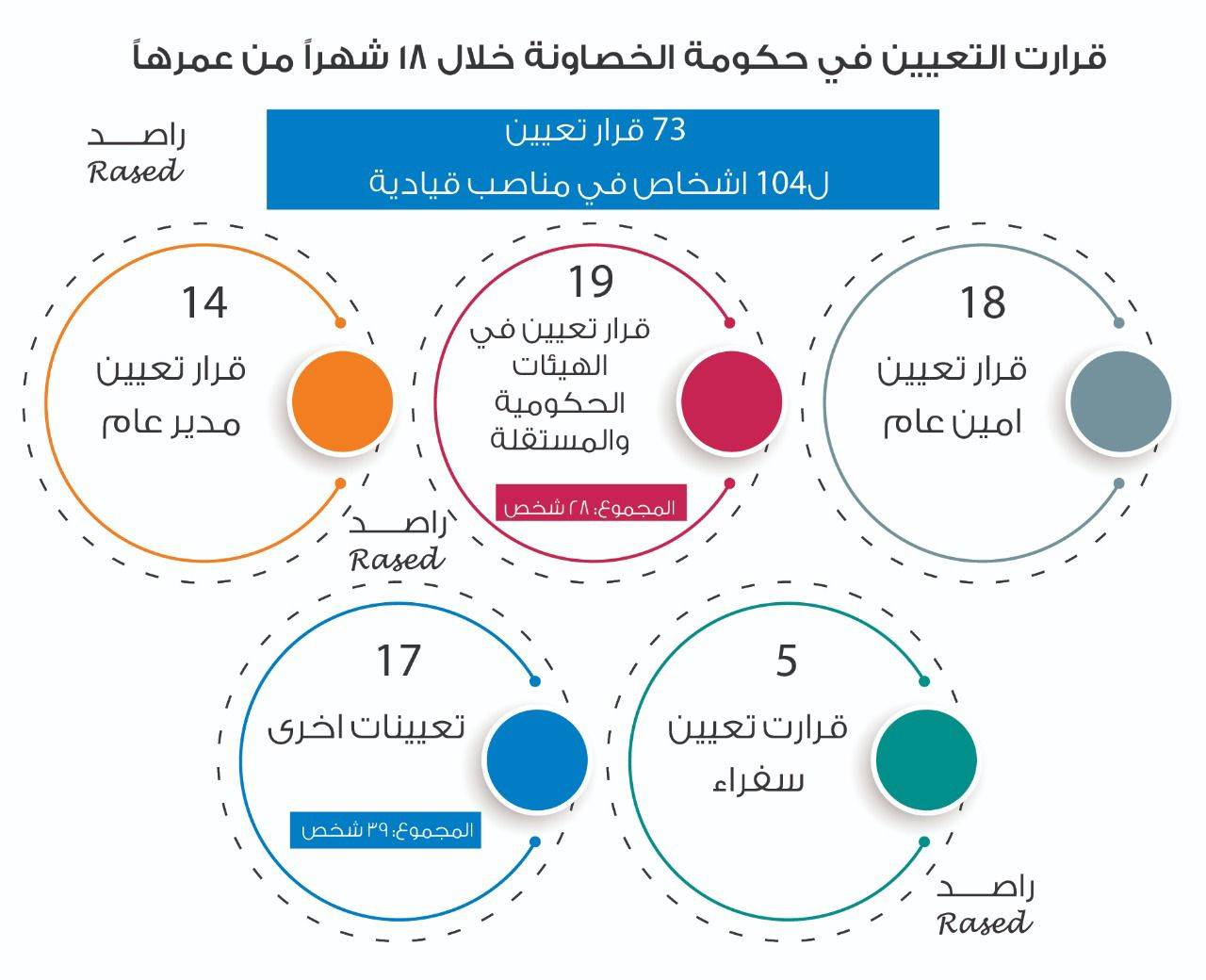 * 73 قرار تعيين خلال عام ونصف تضمنوا تعيين 104 أشخاص في مواقع قيادية