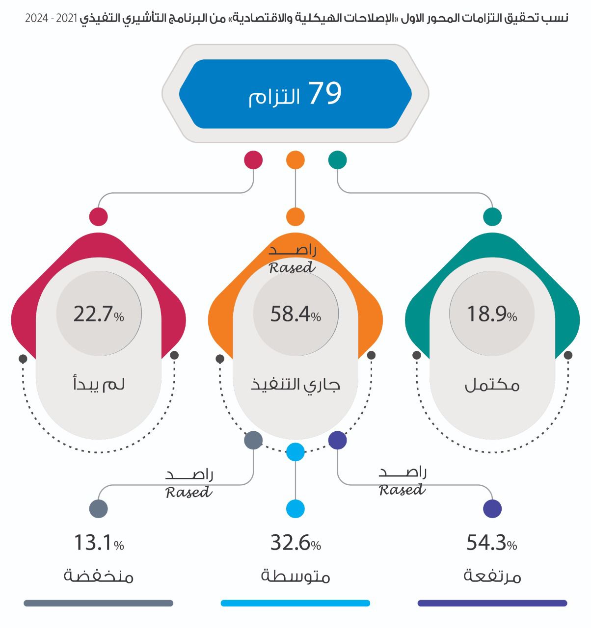 * 79 التزاماً في برنامج الحكومة التأشيري اكتمل منها 19% و 58.3% جاري تنفيذها، و22.7% لم يبدأ العمل بها