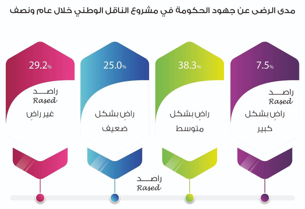 وبما يتعلق في ملف مشروع الناقل الوطني، قال 7.5% من النواب إنهم راضون بشكل كبير، و38.3% راضون بشكل متوسط، بينما 25% راضون بشكل ضعيف، و29.2% غير راضون.