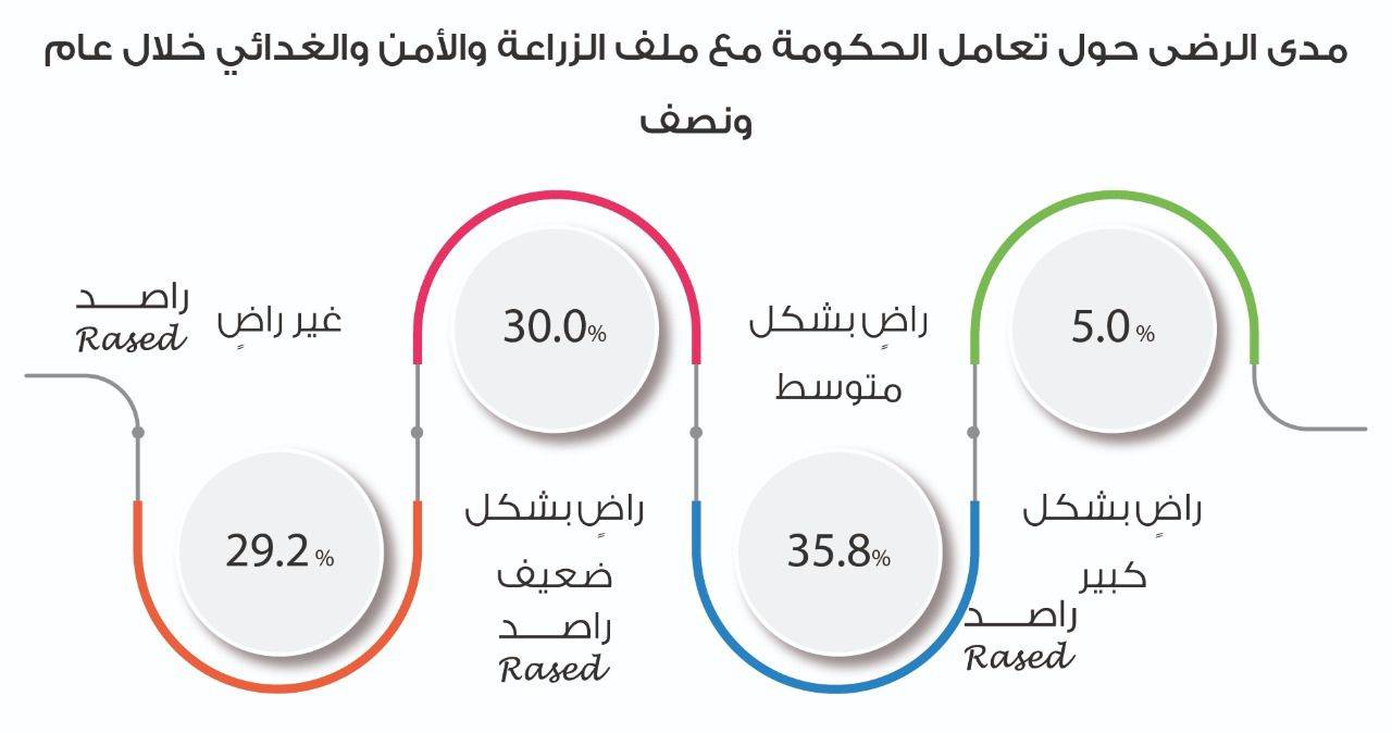وبخصوص ملف الزراعة والأمن الغذائي، تبين أن 5% راضون بشكل كبير، و35.8% راضون بشكل متوسط، و30% راضون بشكل ضعيف، و29.2% غير راضون.