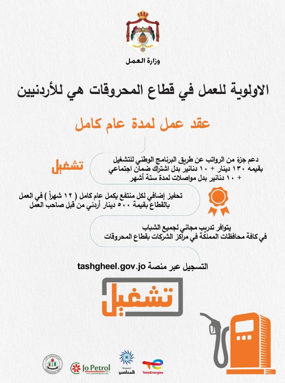وأضاف أن قطاع المحروقات قطاع حيوي ويوجد فيه العديد من فرص العمل، لهذا تهدف الوزارة من خلال هذه المذكرة وبالتعاون مع النقابة العامة لأصحاب المحروقات ومستودعات ووكالات توزيع الغاز وشركات تسويق المشتقات النفطية إلى إعطاء الأولوية للأردنيين للعمل في قطاع المحروقات وزيادة أعداد الأردنيين المشتغلين فيه، إضافة إلى توفير مسار مهني وتأمين طبي وضمان اجتماعي للشباب المشتغلين في هذا القطاع.