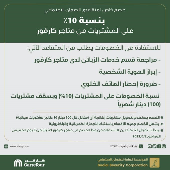 أعلنت المؤسسة العامة للضمان الاجتماعي، اليوم الخميس، عن خصم خاص لمتقاعدي الضمان الاجتماعي بنسبة 10٪ على المشتريات من متاجر كارفور، وفق الشروط التالية: