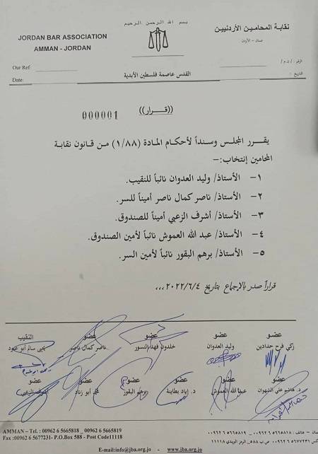 قرر مجلس نقابة المحامين الأردنيين اليوم السبت، وسندا لأحكام المادة (1/88) من قانون النقابة انتخاب المحامي وليد العدوان نائبا للنقيب.