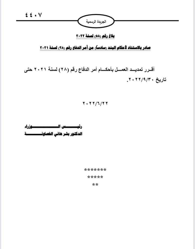 قرَّر رئيس الوزراء الدكتور بشر الخصاونة، اليوم الخميس، تمديد العمل بأحكام أمر الدِّفاع رقم (28) لسنة 2021م، الصَّادر بمقتضى أحكام قانون الدفاع رقم 13 لسنة 1992م، والمتعلِّق بحبس المدين، حتَّى تاريخ 30/9/2022م.