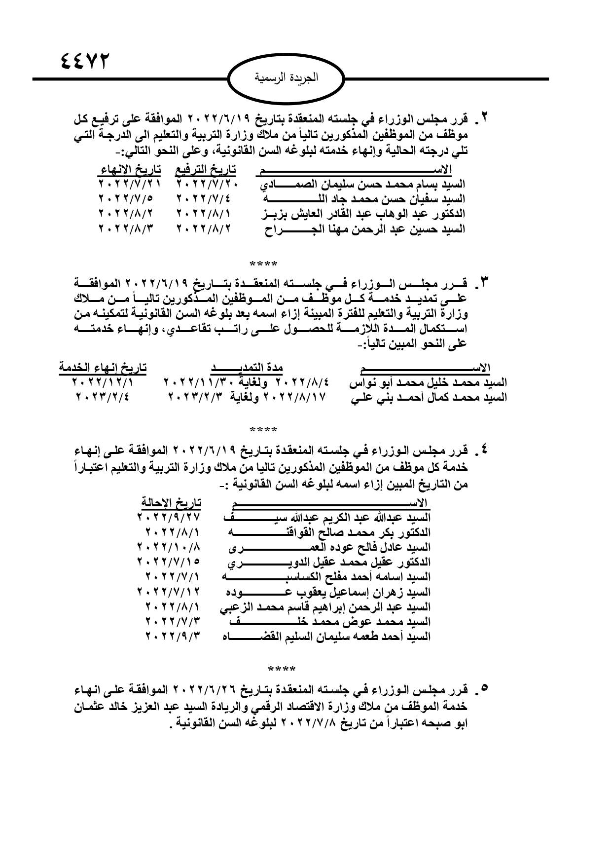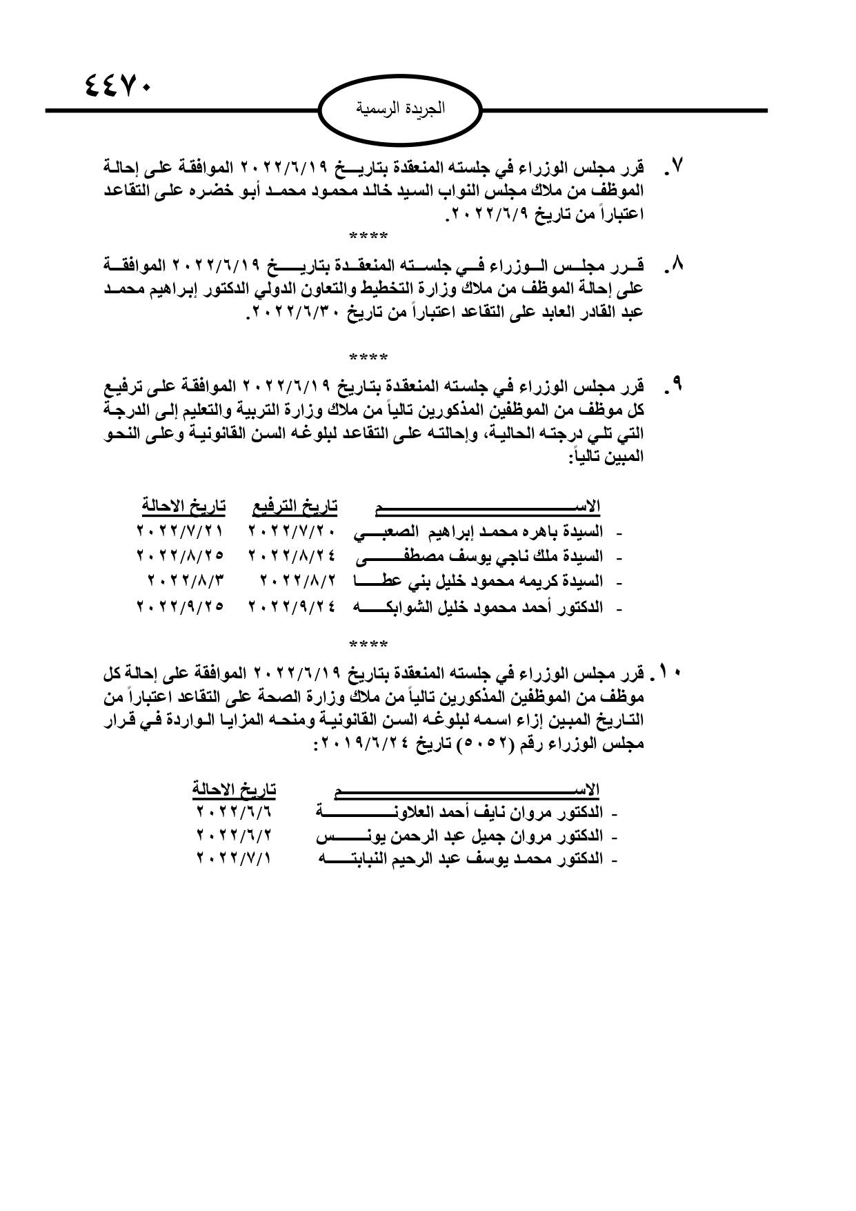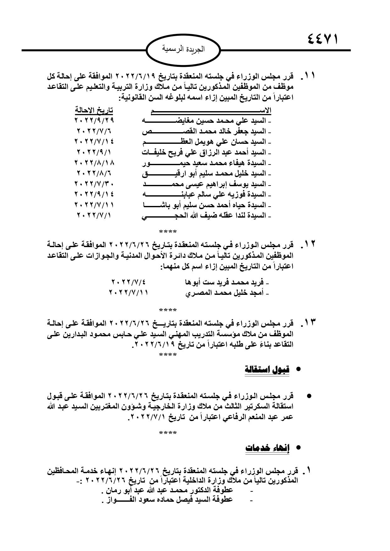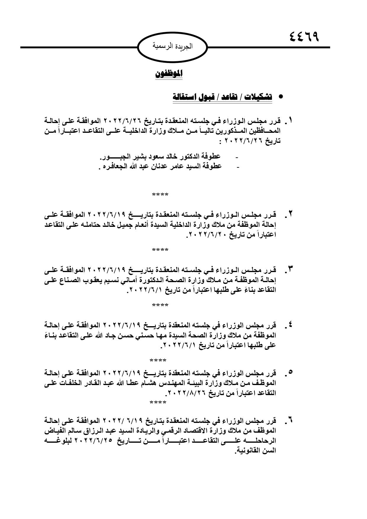 قرر مجلس الوزراء الموافقة على اجراء احالات الى التقاعد، لعدد من الموظفين في المؤسسات والوزارات.