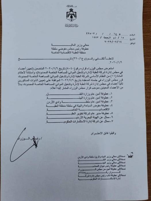 قرر مجلس الوزراء الموافقة على تعيين المذكورين تاليا في مجلس إدارة شركة العقبة لإدارة وتشغيل الموانئ المساهمة الخاصة المحدودة بدلا من الأعضاء المعينين بموجب قرار مجلس الوزراء بتاريخ 6 / 1/ 2020.