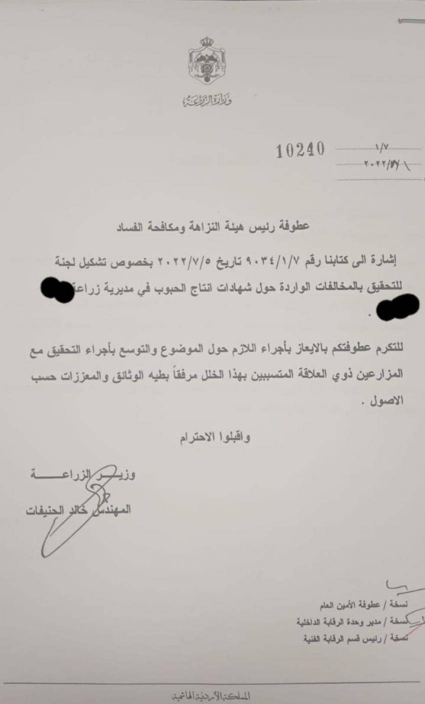 وبين وزير الزراعة المهندس خالد الحنيفات أن الوزارة ومن خلال الاجراءات الرقابية للجان التدقيق وعلى مدى الاشهر الماضية حول شهادات انتاج الحبوب الصادرة عن مديريات الزراعة لعام 2022 فقد تم رصد مخالفات متكررة ووجود بعض الأراضي التي تم استعمالها في اصدار اكثر من شهادة لأكثر من مستفيد وبناء على هذه المعلومات تمت اجراءات التحقق والمتابعة على مدى أشهر لهذا الملف وإجراء المقارنات وتشكيل لجان في المناطق للعمل على مقارنة الشهادات والكميات والمساحات والأوراق اللازمة وزيارة تلك المواقع فقد تبين وجود مخالفات لألية منح شهادات المنشأ.