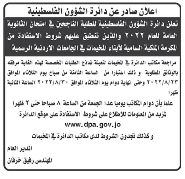 ودعت الطلبة الناجحين في الثانوية العامة لسنة 2022، إلى مراجعة مكاتب الدائرة في المخيمات لتعبئة نماذج الطلبات المخصصة لهذه الغاية، اعتبارا من صباح يوم الثلاثاء 23/8/2022 وحتى نهاية يوم الثلاثاء الموافق 30/8/2022.