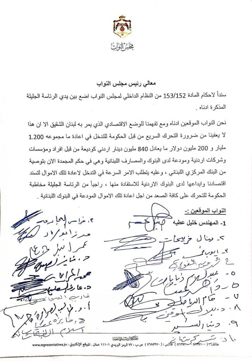 وقال عطية في المذكرة، "ومع تفهمنا للوضع الاقتصادي الذي يمر به لبنان الشقيق الا ان هذا لا يعفينا من ضرورة التحرك السريع من قبل الحكومة للتدخل في إعادة ما مجموعه 1.200 مليار دولار ما يعادل 840 مليون دينار اردني كوديعة من قبل افراد ومؤسسات وشركات اردنية ومودعة لدى البنوك والمصارف اللبنانية وهي في حكم المجمدة الان بتوصية من البنك المركزي اللبناني".